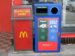 Fast food restaurants have reduced their waste in some noticeable ways that have made a positive impact on the environment “but it has all been voluntary and usually under pressure from green groups. McDonald’s made headlines back in 1989 when, at the urging of environmentalists, it switched its hamburger packaging from non-recyclable Styrofoam to recyclable paper wraps and cardboard boxes. The company also replaced its bleached paper carryout bags with unbleached bags and made other green-friendly packaging advances.”*